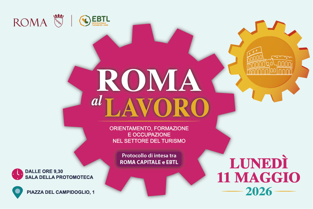 Lunedì 11 maggio, dalle ore 9.30, presso la sala Protomoteca del Campidoglio, si terrà l'iniziativa "Roma al Lavoro - Orientamento, Formazione e Occupazione nel settore del Turismo" organizzata dall'Assessorato alla Scuola, Formazione e Lavoro di Roma Capitale e dall'Ente Bilaterale del Turismo del Lazio (EBTL).